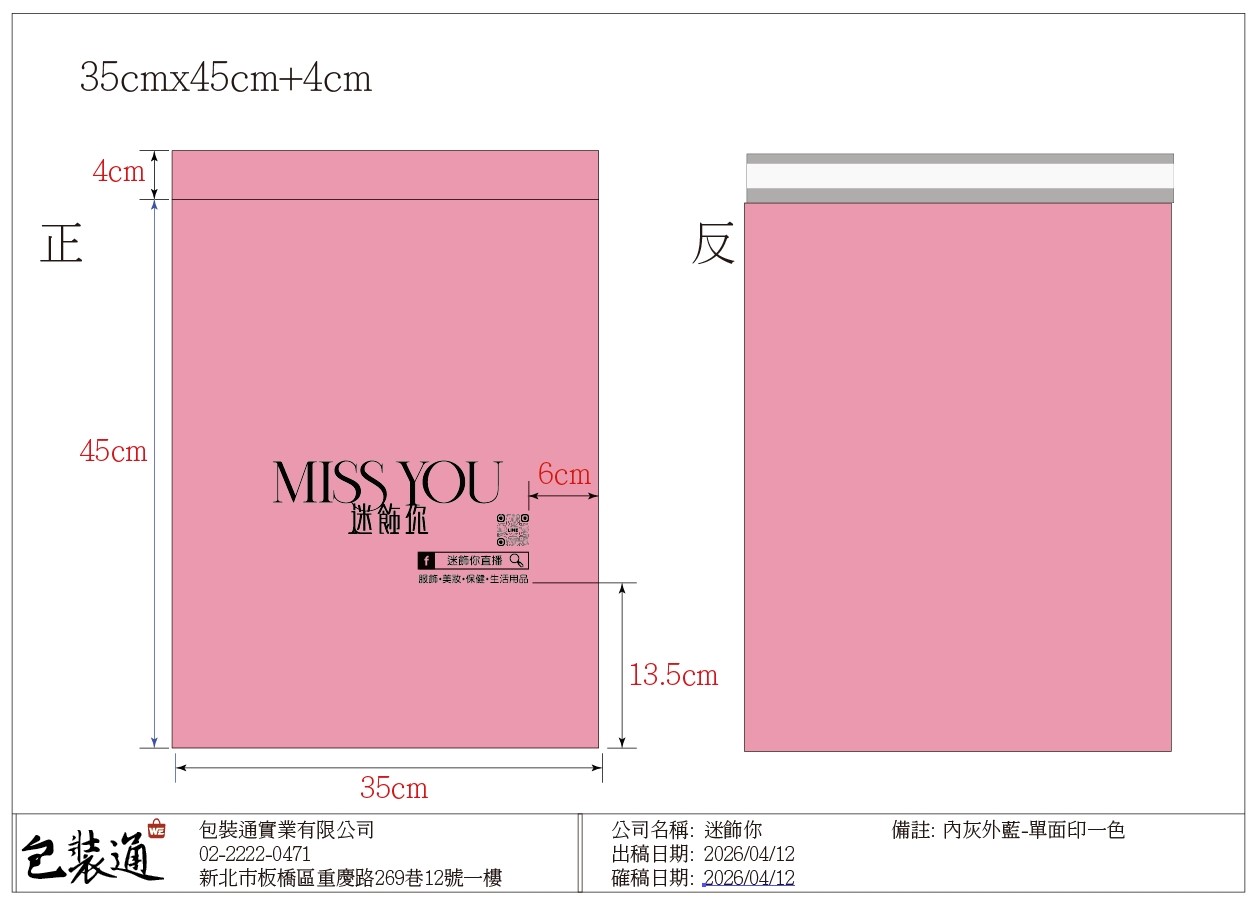 【MISS YOU】薔薇粉(淡霧內灰外粉)印一色35x45+4cm破壞袋,3000只(加稅)